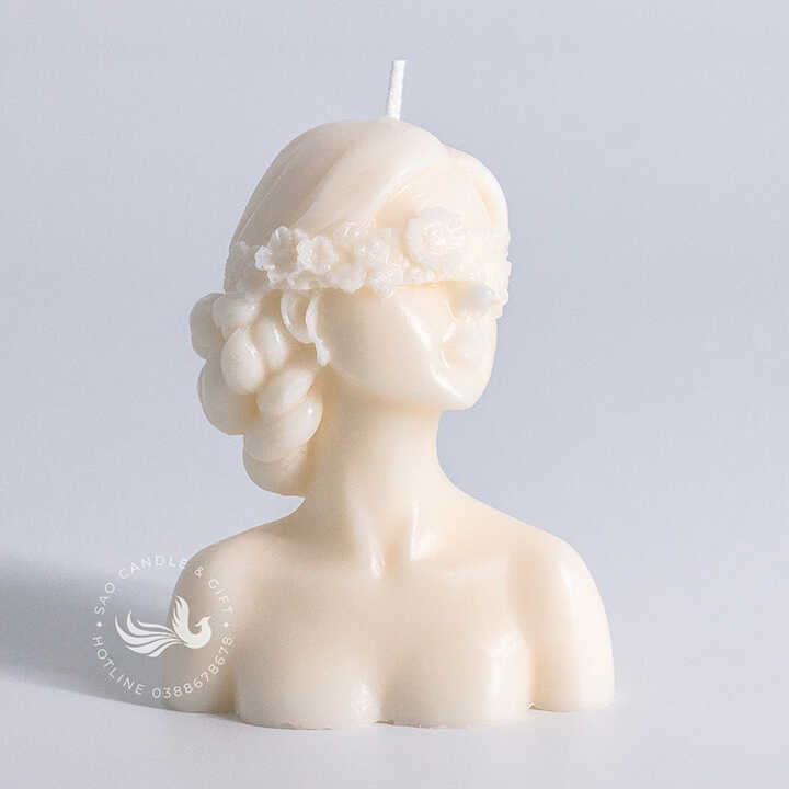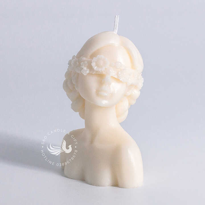 Nến Thơm Tạo Hình Cô Gái Mộng Mơ là một cây nến thơm thủ công, được tạo hình nghệ thuật theo dáng một bức tượng bán thân của một người phụ nữ với vẻ đẹp cổ điển và lãng mạn. Nến có hình dáng một người phụ nữ với khuôn mặt thanh tú, đôi mắt nhắm lại, và một bờ vai trần duyên dáng. Mái tóc của nàng được tết và búi gọn sau gáy, điểm xuyết bằng một vòng hoa nhỏ xinh xắn trên trán, tạo cảm giác nhẹ nhàng và lãng mạn. Các đường nét được chạm khắc mềm mại, toát lên vẻ đẹp bình yên và thanh thoát.