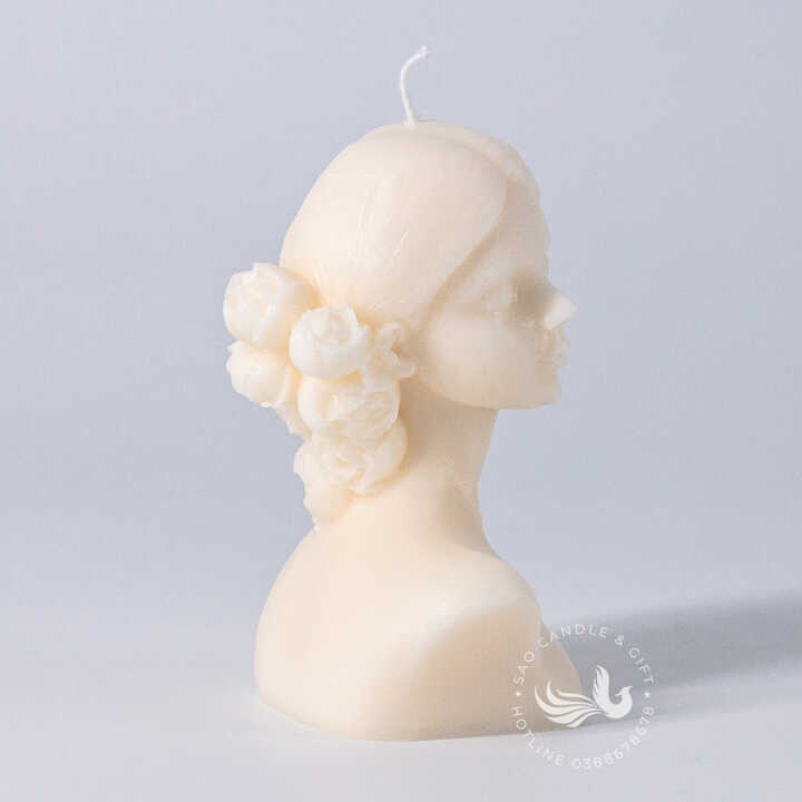 Nến Thơm Tạo Hình Cô Gái Tóc Hoa Hồng là một cây nến thơm thủ công, được tạo hình nghệ thuật theo dáng một bức tượng bán thân của một người phụ nữ với vẻ đẹp cổ điển và lãng mạn. Nến có hình dáng một người phụ nữ với khuôn mặt thanh tú, đôi mắt nhắm lại, và một bờ vai trần duyên dáng. Mái tóc của nàng được búi gọn, điểm xuyết bằng những bông hoa nhỏ xinh ở hai bên, tạo cảm giác nhẹ nhàng và lãng mạn. Các đường nét được chạm khắc mềm mại, toát lên vẻ đẹp bình yên và thanh thoát.