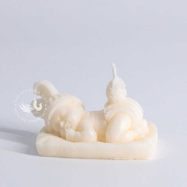 Nến Thơm Tạo Hình Em Bé Nằm Sấp Dễ Thương là một cây nến thơm thủ công, được tạo hình tỉ mỉ theo dáng một em bé đang ngủ say. Nến có hình dáng một em bé sơ sinh đang nằm sấp trên một chiếc gối, với tư thế cuộn tròn đáng yêu. Em bé đội một chiếc mũ len có chóp và mặc một chiếc áo len với các đường vân nổi. Khuôn mặt em bé được chạm khắc đơn giản, đôi mắt nhắm nghiền, tạo cảm giác bình yên, thư thái.