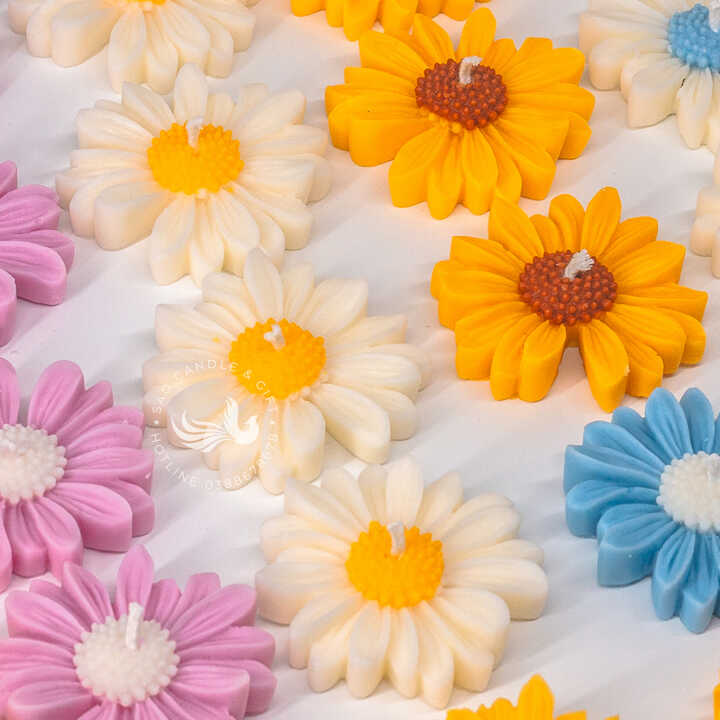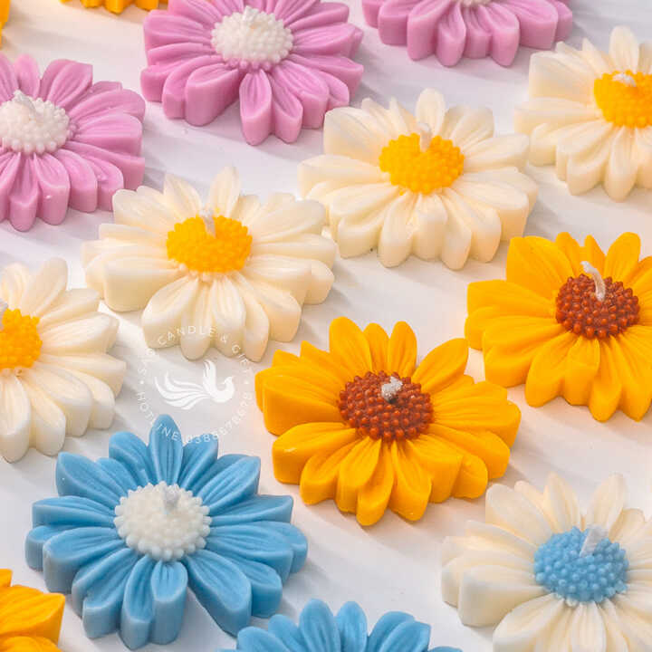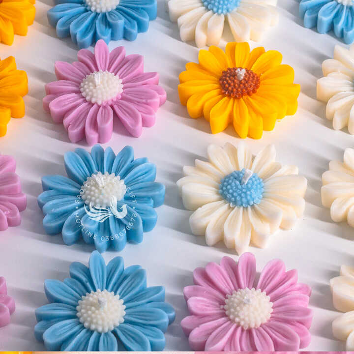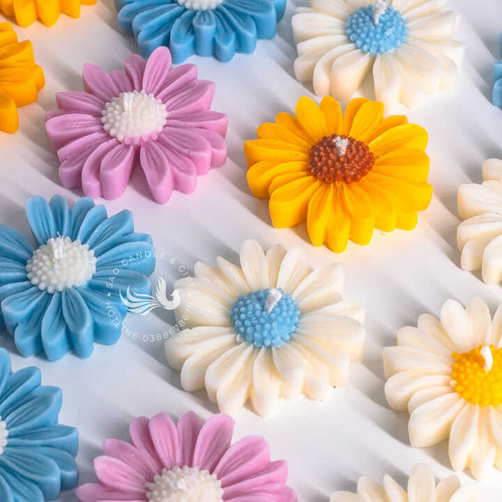 Nến Thơm Tạo Hình Hoa Cúc Họa Mi là một bộ sưu tập nến thơm thủ công, được tạo hình sống động như những đóa hoa cúc nhiều màu sắc. Những cây nến này có kích thước nhỏ, được sắp xếp ngẫu nhiên trên một bề mặt trắng. Mỗi cây nến đều có hình dáng một bông hoa cúc đang nở, với các lớp cánh hoa mỏng, xếp đều đặn quanh một nhụy hoa tròn ở trung tâm. Các chi tiết được làm tỉ mỉ, tạo vẻ ngoài tự nhiên và đáng yêu.
