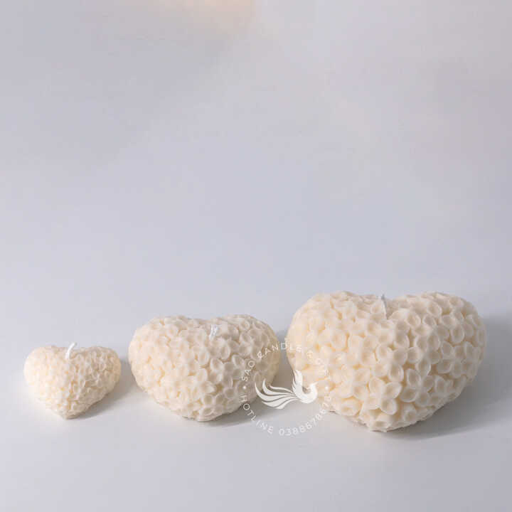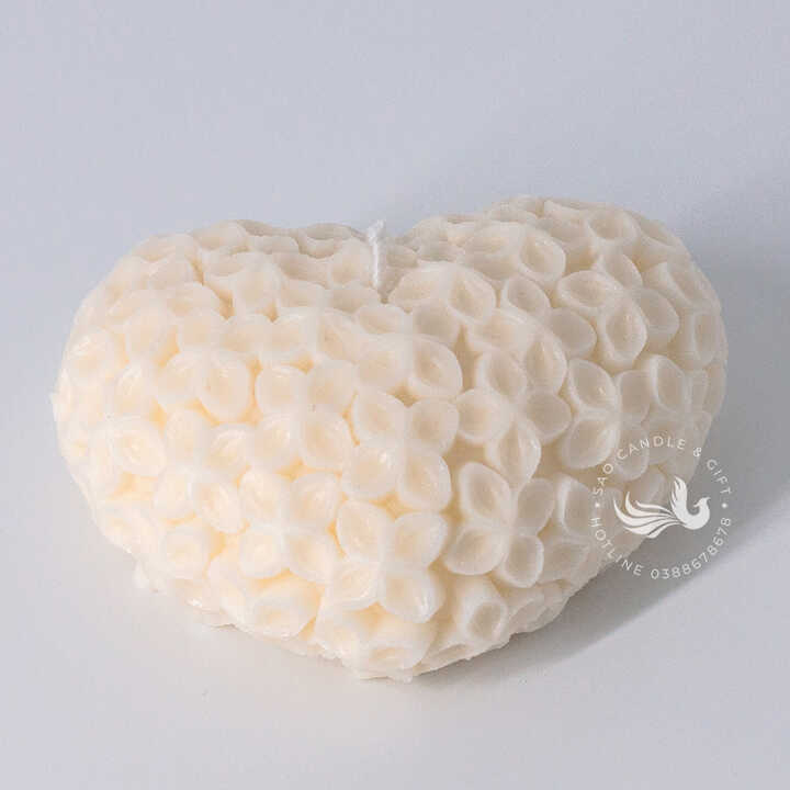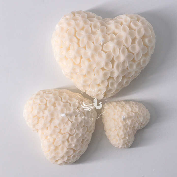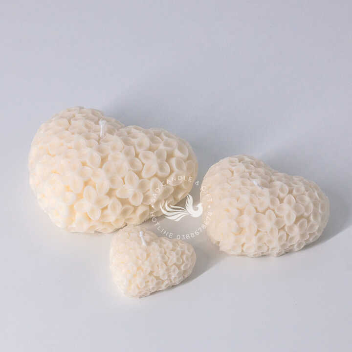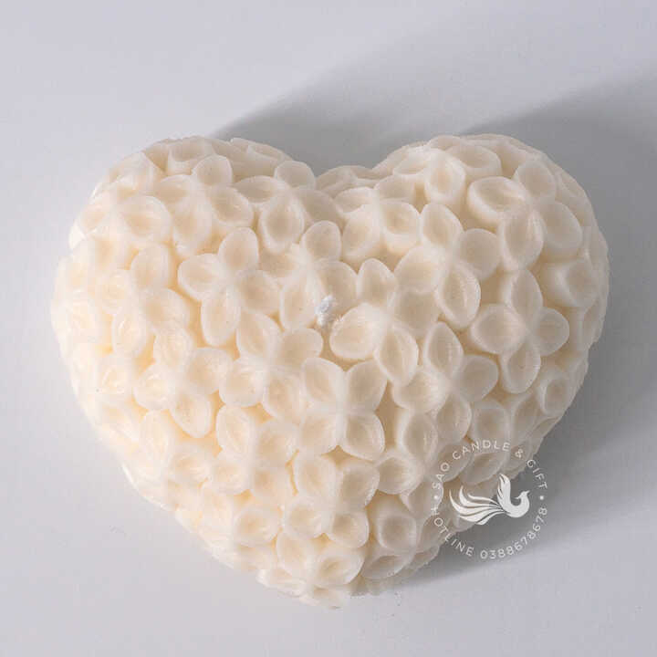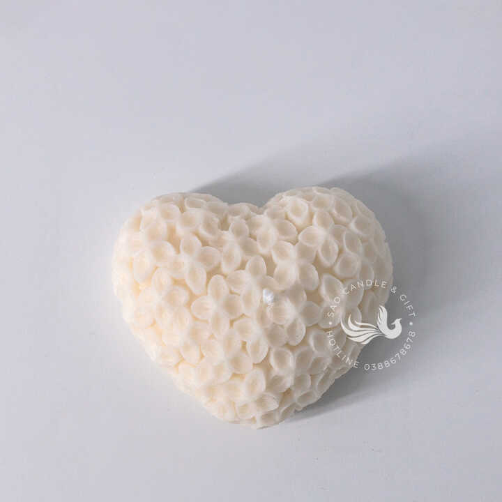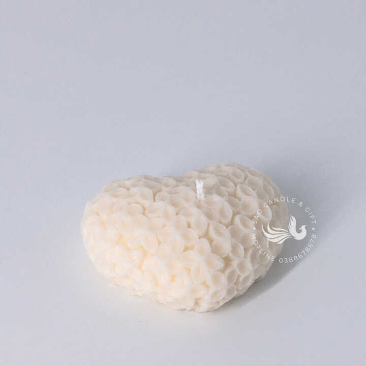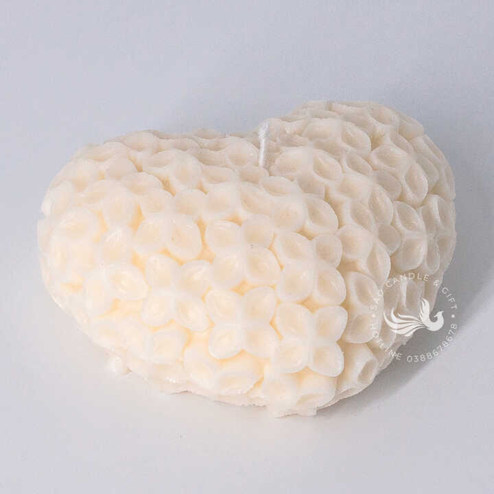 Nến Thơm Tạo Hình Trái Tim Hoa là một cây nến thơm thủ công, được tạo hình tỉ mỉ theo dáng một trái tim lớn, với bề mặt được bao phủ bởi các đóa hoa nhỏ. Nến có hình dạng một trái tim đầy đặn, với bề mặt nổi bật hình ảnh những bông hoa nhỏ xinh, được chạm khắc nổi, xếp san sát nhau. Các bông hoa này tạo nên một kết cấu 3D độc đáo, vừa mang vẻ đẹp của một bó hoa, vừa lãng mạn với hình dáng trái tim.